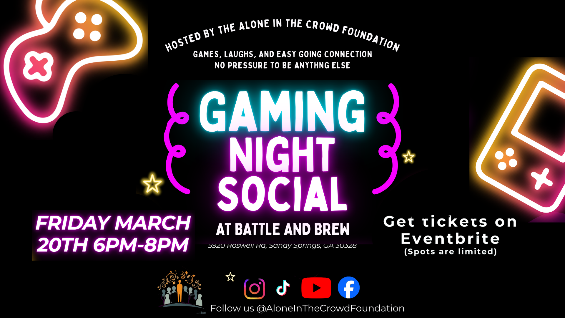 Looking for a relaxed night of games, good vibes, and great company? Join us for a Gaming Night Social hosted with the Alone in the Crowd Foundation at Battle & Brew Sandy Springs.